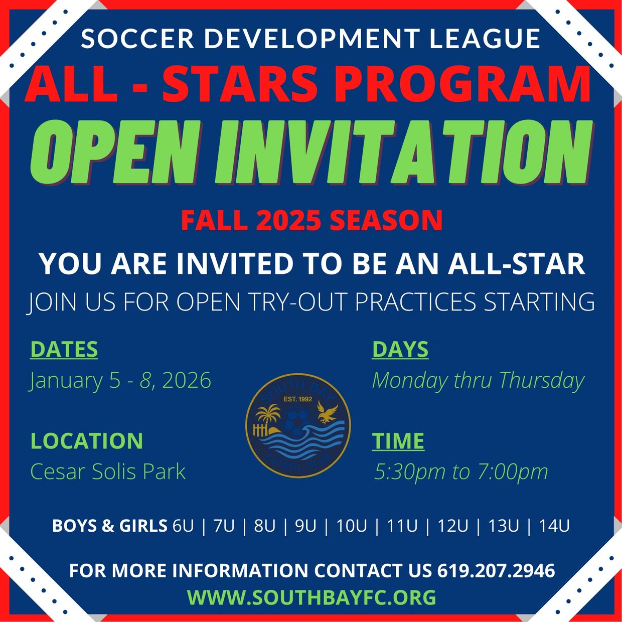 PLAYERS MUST BE REGISTERED FOR UPCOMING WINTER 2026 SEASON TO PARTICIPATE IN THE OPEN TRYOUTS FOR ALL-STAR TEAMS.